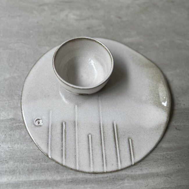 This handmade round flat plate “Linea” is mainly used as a presentation of finger food, sushi, cheese, charcuterie, snacks, mignardises and pastries or cakes.