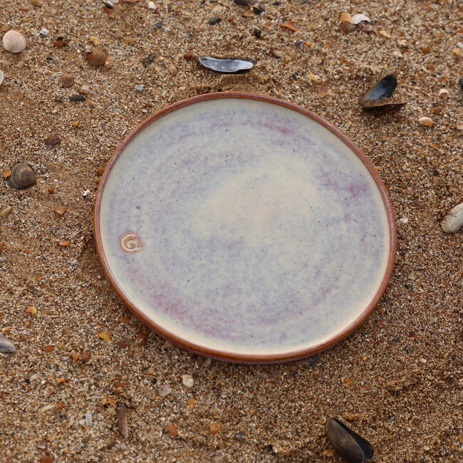 The "Sunrise" collection is made of speckled Pyerite clay and is finished with a subtle magenta glaze. On the outside of each plate I deliberately leave a rough clay zone at the bottom in contrast to the glazed inside and top.
