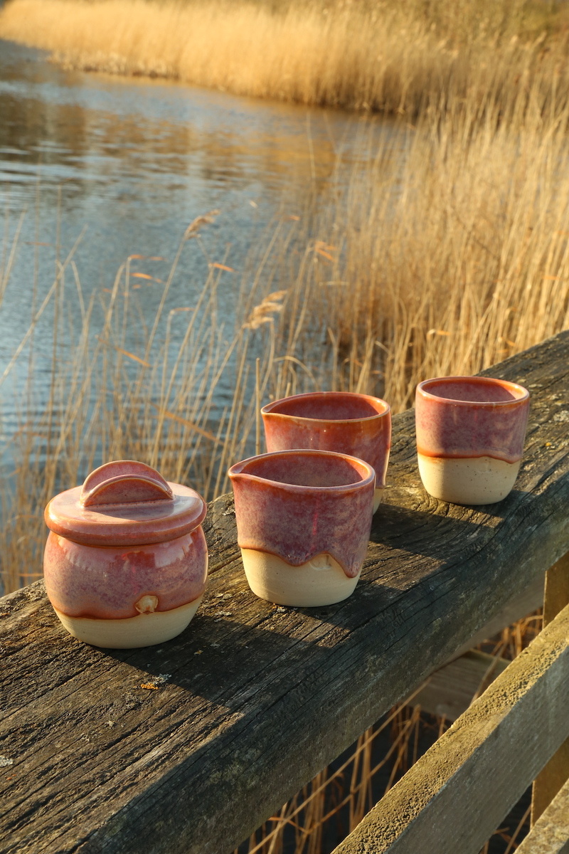 Every coffee set and tea set is different and has its imperfection, which makes it so unique and personal. The art is to combine different ceramic bags in color and shape into one. There are different sizes from expresso cup to coffee cup to a larger tea mug.