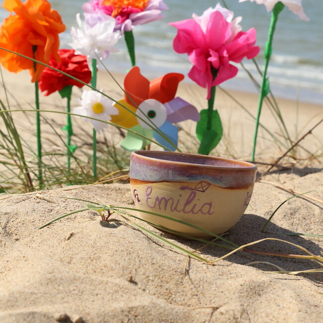 The name of your child, grandchild, godchild, girl next door, boy next door, nephew, niece ... is carefully written with a brush in my own handwriting. This is baked in the glaze oven, making it dishwasher safe.