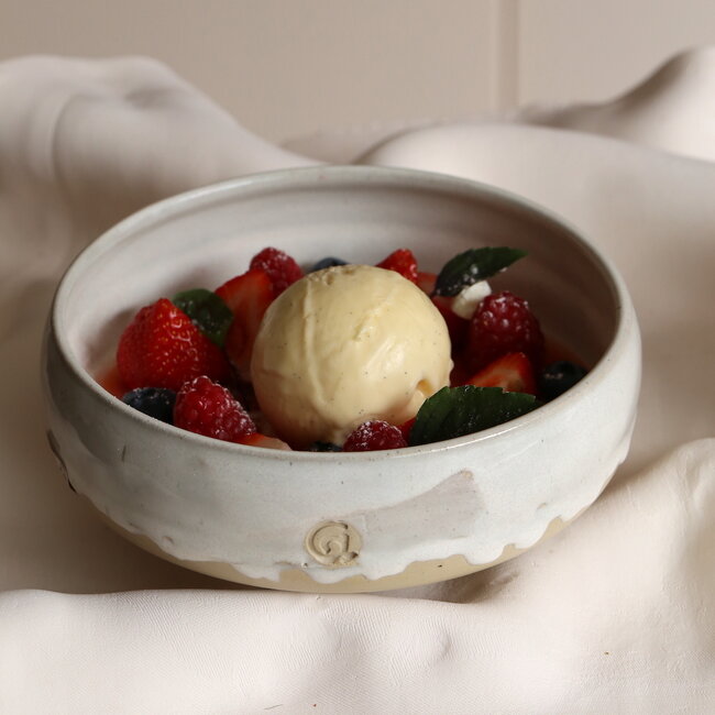 The "White Dunes" collection is made from natural white turning clay and is finished with a white glaze that flows beautifully into each other, making each piece different and unique. On the outside of each bowl I deliberately leave a rough clay zone at the bottom in contrast to the glazed inside and top. The bottom of the glaze layer is finished with a pipette.