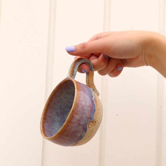 La collection «Sunrise» est fabriquée en argile blanche naturelle Pyerite et est recouverte d'une glaçure magenta à l'extérieur. À l'intérieur, la glaçure sunrise se fondent magnifiquement pour créer un effet unique. Sur l'extérieur de chaque tasse, je laisse délibérément une zone d'argile rugueuse au fond pour contraster avec l'intérieur et le dessus émaillés.