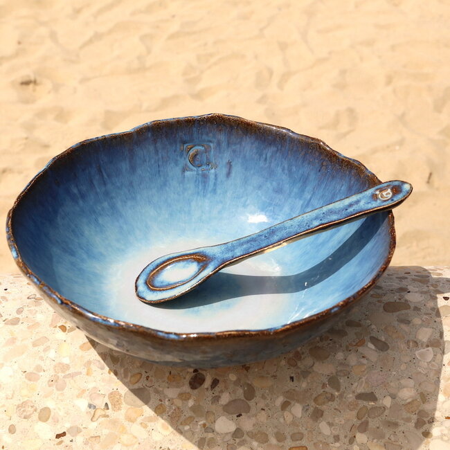 Fini ici avec un magnifique glacis bleu, notre glacis Beach. Là où la glaçure est plus épaisse, on obtient une nuance de couleur allant vers le bleu clair. Ce qui donne au bol un look spécial