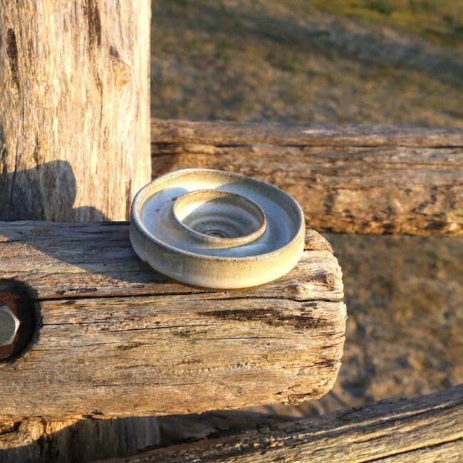 Ce plat à huile en céramique a un rebord pour recueillir l'huile et a été réalisé avec le plateau tournant par la céramiste et décoratrice d'intérieur Ann Van Beersel pour Artisann.