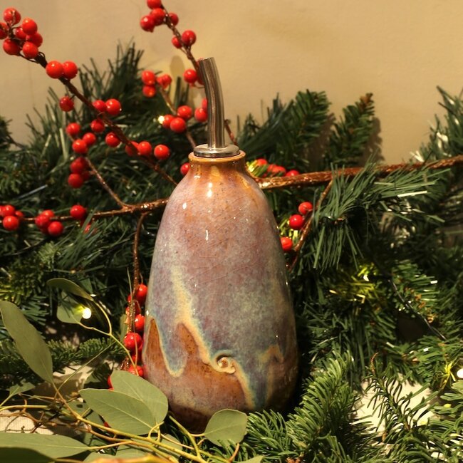 Nos bouteilles d'huile sont tournées à la main et ont toujours des formes différentes.Ils sont fabriqués dans une argile naturelle finie avec nos différents émaux Artisann :