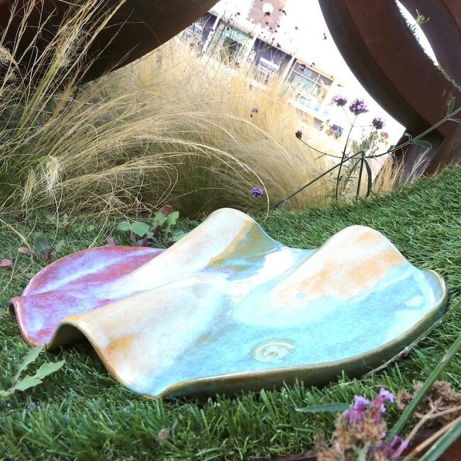 Le plat à tapas « Wave » est fabriqué à la main à partir de notre argile blanche naturelle et émaillé ici en duo Sunrise, menthe et moutarde.