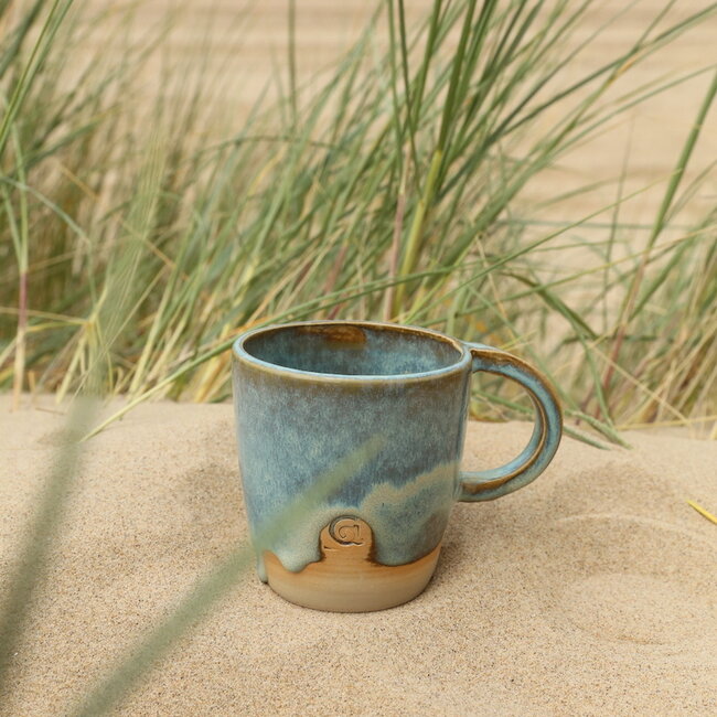La collection « Menthe » est fabriquée en argile blanche naturelle et est recouverte d'une glaçure menthe à l'extérieur. À l'intérieur, la glaçure menthe et la glaçure lagon verte se fondent magnifiquement pour créer un effet unique. Sur l'extérieur de chaque tasse, je laisse délibérément une zone d'argile rugueuse au fond pour contraster avec l'intérieur et le dessus émaillés.