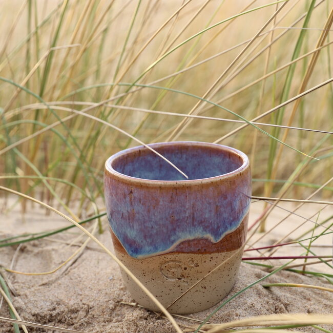 La collection "Sunrise" est faite d'argile pyrite mouchetée et est finie avec un subtil glacis. A l'extérieur de chaque tasse je laisse volontairement une zone d'argile rugueuse au fond en contraste avec l'intérieur et le dessus émaillés.