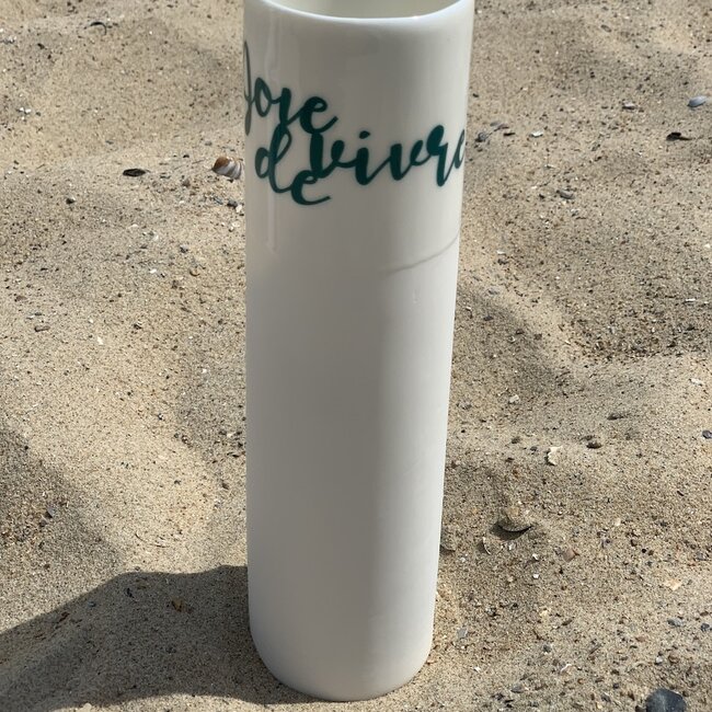 La "Columna" est un beau cylindre droit en porcelaine qui est entièrement transparent à l'intérieur et le bord supérieur à l'extérieur. Par exemple, la finesse blanche de la porcelaine se détache bien des lettres colorées. Les lettres colorées vert sont cuites dans un troisième plateau avec un transfert sur le plateau supérieur. À l'arrière, le logo Artisann est incorporé dans une coque de la même couleur.