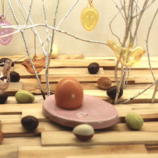 Uniek handgemaakt eigentijds keramisch eidopje in roze glazuur afgewerkt