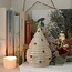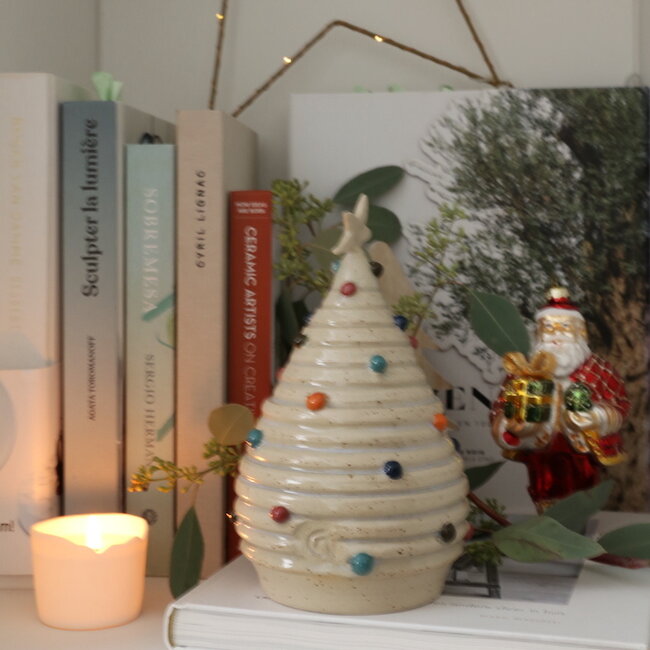 De artistieke kerstboom is met de draaischijf gemaakt. Elke boom is verschillend van curve, decoratie, glazuur en tekening.