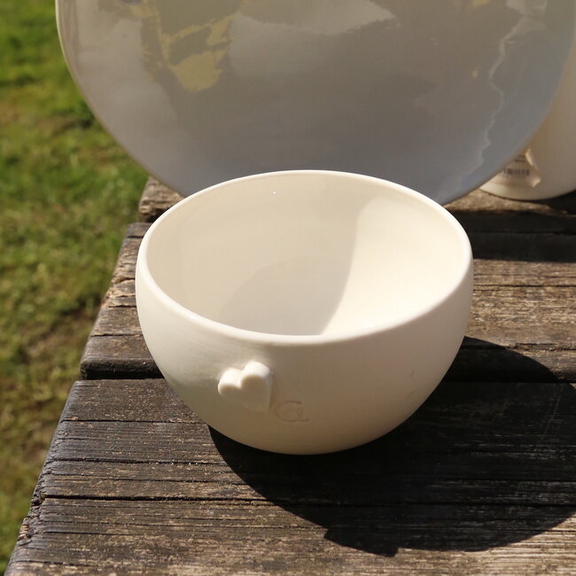 De porseleinen collectie "Hart-Heart-Coeur" is gemaakt van een Audrey Blackman porselein en wordt afgewerkt met een glanzende transparante glazuur en een niet geglazuurd hartje. Mijn werk wordt bestempeld met de gevormde “a” van artisann en is gepatenteerd.