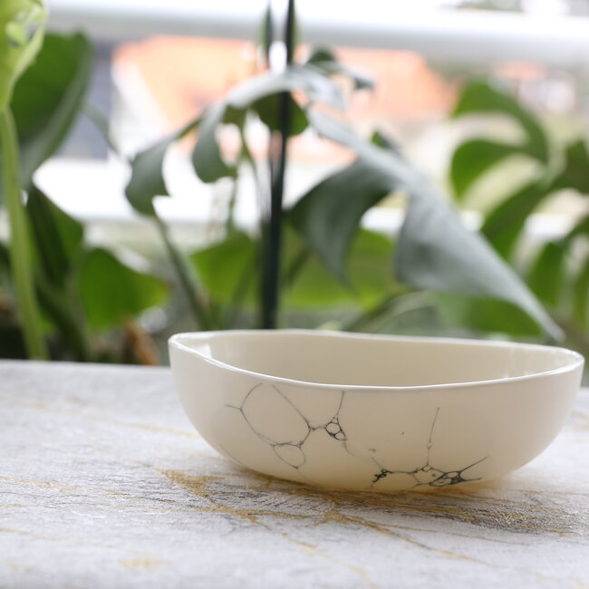 Dit uniek en eigentijds handgemaakt schaaltje is zeer handig en licht in gebruik. Gemaakt in gietporselein en afgewerkt met een transparante glanzende glazuur en afgewerkt met de belletjestechniek.