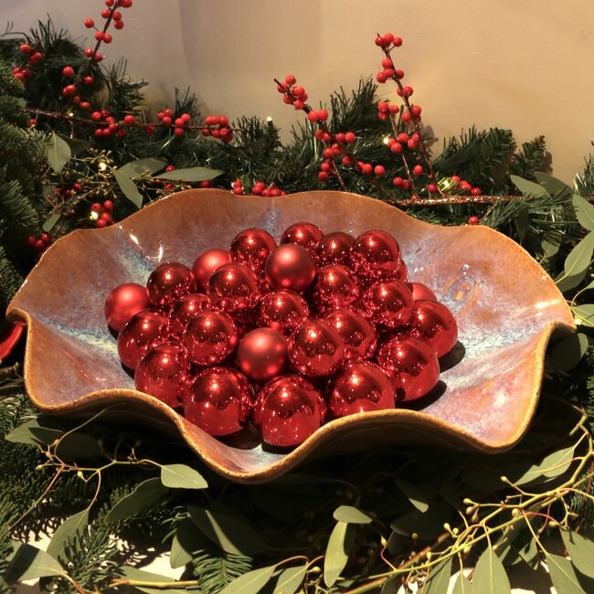 De collectie "Sunrise" is gemaakt van een chamotte klei en wordt afgewerkt met een mooie magenta floating glazuur. Aan de buitenzijde van elke schaal laat ik bewust een ruwe kleizone in contrast met de geglazuurde binnen-en bovenzijde. De kleur van de magenta floating glazuur reageert zeer mooi met de chamotte klei wat niet mogelijk is met een andere klei. Ik maak een bewuste keuze van de klei in combinatie met de aangepaste glazuur.