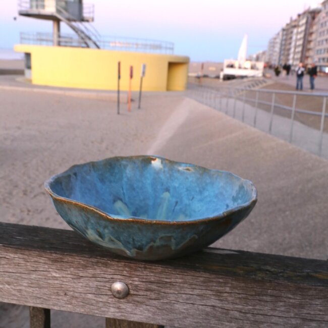 Is hier afgewerkt met een mooie groen-blauwe glazuur. Waar de glazuur dikker ligt krijgt men een kleurschakering naar het wit. Wat de schaal een speciale look geeft.