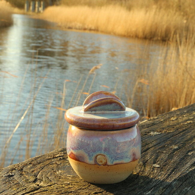 Suikerpotje "Sunrise" handgemaakt in spikkelklei met een uniek ontworpen Artisann dekseltje
