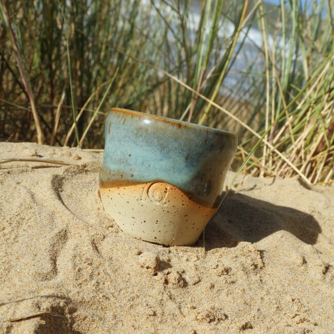 Uniek, exclusief en elegant handgemaakt tasje voor koffie, thee, matcha, ... gemaakt in onze glazuur Munt. Speciaal in model, afgewerkt met golvende lijnen. Het tasje "Léonore" wordt gedraaid als een cilinder op de draaischijf. Ik realiseer zo een tasje in verschillende etappes nl. de klei wordt eerst gecentreerd, een kuiltje maken, de wand optrekken en als laatste wordt er met een speciale houten tool een golvende beweging in gedrukt.