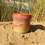 De collectie "Sungreen" is gemaakt van natuurlijke witte klei en wordt aan de buitenzijde met een oranje, groene glazuur afgewerkt. Aan de buitenzijde van elk tasje laat ik bewust aan de onderzijde een ruwe kleizone in contrast met de geglazuurde binnen-en bovenzijde.