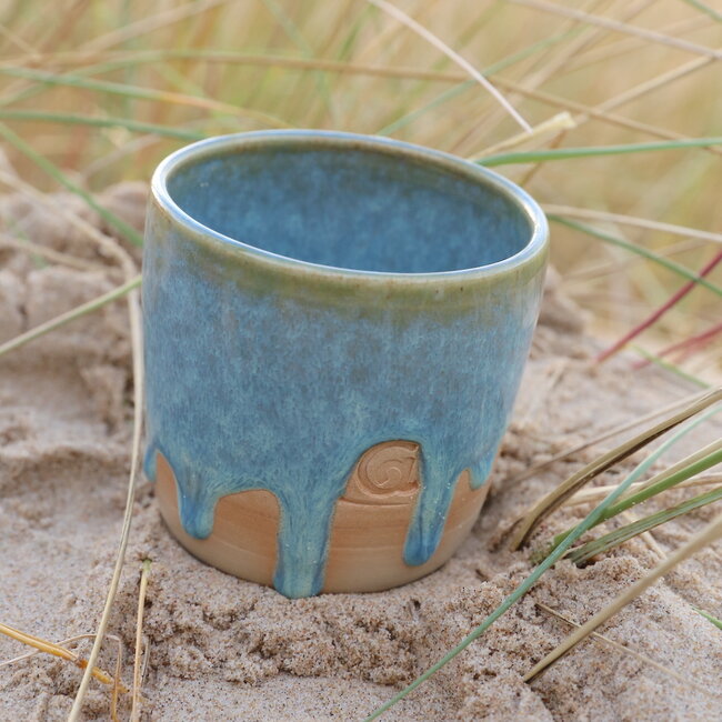 De collectie "Munt" is gemaakt van natuurlijke witte klei en wordt aan de buitenzijde met een muntkleurige glazuur afgewerkt. Aan de binnenzijde vloeit de muntkleurige en groene laguneglazuur mooi in elkaar tot een uniek effect. Aan de buitenzijde van elke tas laat ik bewust aan de onderzijde een ruwe kleizone in contrast met de geglazuurde binnen-en bovenzijde.