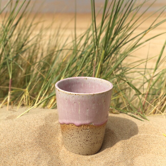 De collectie "Roos" is gemaakt van natuurlijke witte Spots klei en wordt aan de buitenzijde met een roze glazuur afgewerkt. Aan de buitenzijde van elke mok laat ik bewust aan de onderzijde een ruwe kleizone in contrast met de geglazuurde binnen-en bovenzijde.