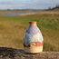 Dit keramisch vaasje is hand gedraaid met witte klei en afgewerkt met onze glazuren in verschillende kleuren verkrijgbaar.